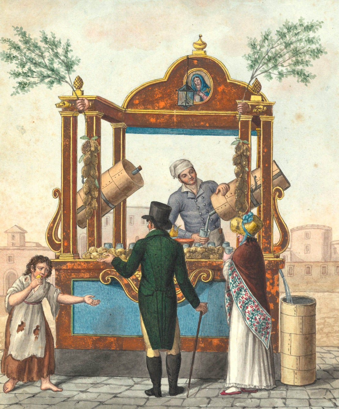Quanto possa essere stato, e sia ancora, importante l’elemento ACQUA per i napoletani lo si può capire solo se si pensa che quei posti fissi: si, i chioschi, posti lungo le strade o ai crocicchi cittadini, dal centro alla periferia, costruiti in muratura, in legno o in ferro battuto, rispettosi del disegno dettato dalle mode dell’epoca, erano, e sono tutt’ora, per tutti gli assetati napoletani, nient’altro che “’A Banca ‘e ll’Acqua”.