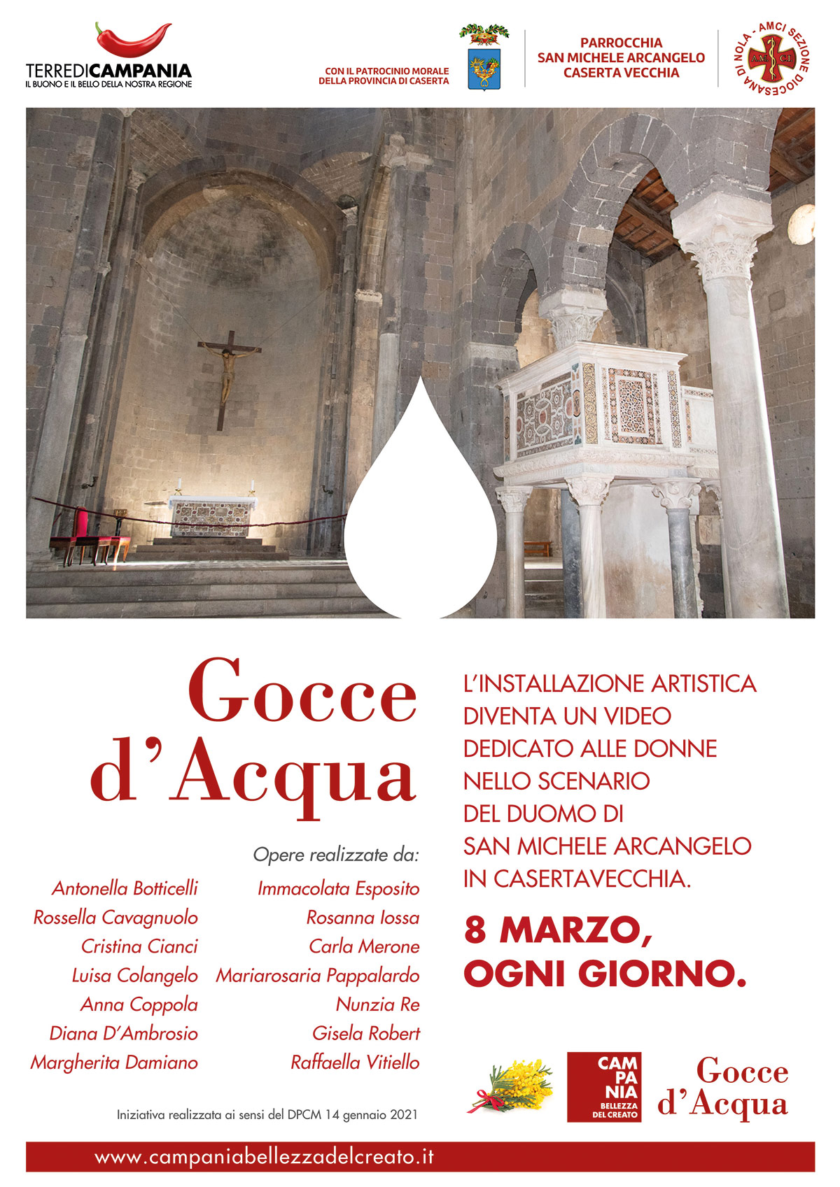 Per celebrare l’8 marzo 2021, Giornata Internazionale delle Donne, l’Associazione Culturale Terre di Campania ha scelto di aggiungere una nuova tappa al percorso espositivo virtuale dell’installazione artistica “Gocce d’Acqua”, ideata da Giuseppe Ottaiano nell’ambito del progetto “Campania Bellezza del Creato”. Dopo le video-esposizioni realizzate presso il Battistero paleocristiano di Santa Maria Maggiore a Nocera Superiore e presso la Chiesa di SS. Annunziata di Marigliano, la nuova location scelta per l’occasione è il Duomo di San Michele Arcangelo in Casertavecchia, che ha ospitato le opere realizzate da 15 artiste campane.