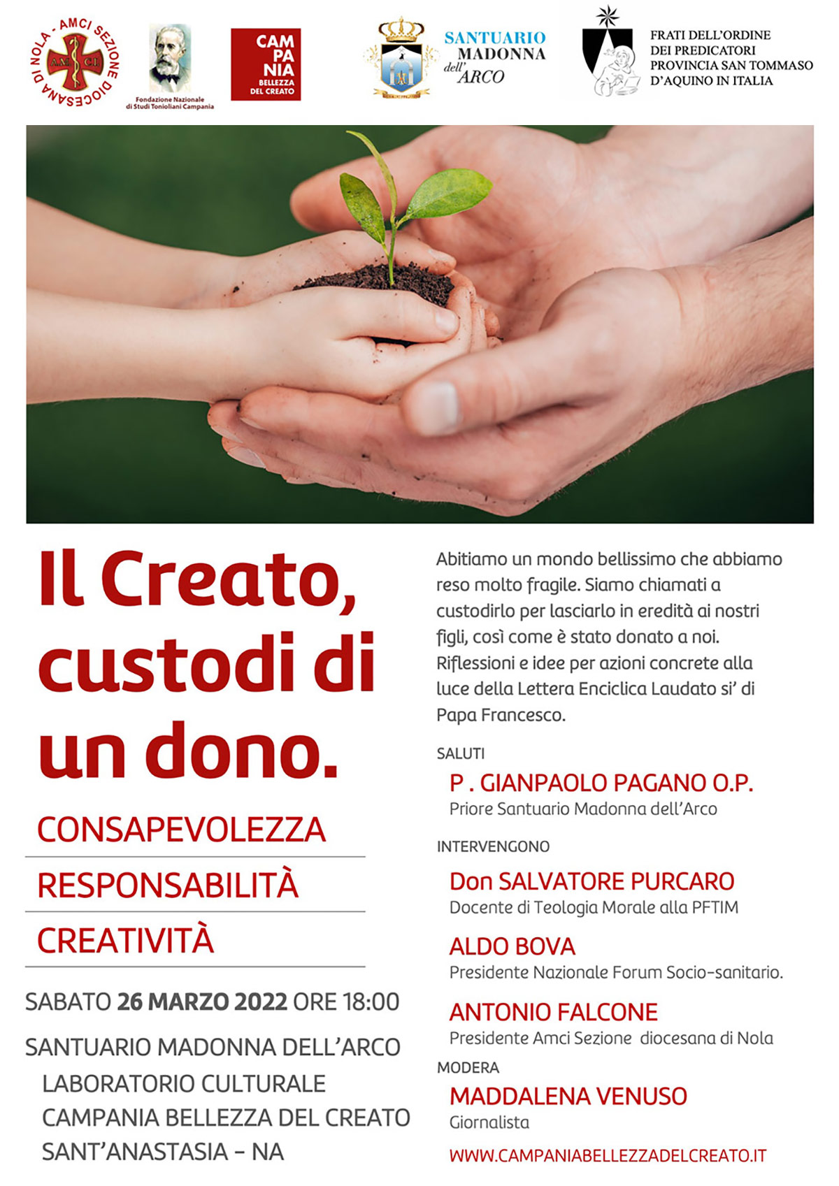 Ne parleremo insieme, sabato 26 Marzo 2022 Ore 18:00 presso il Santuario Madonna Dell’Arco nel Laboratorio Culturale “Campania Bellezza Del Creato” in Sant’Anastasia (Na).